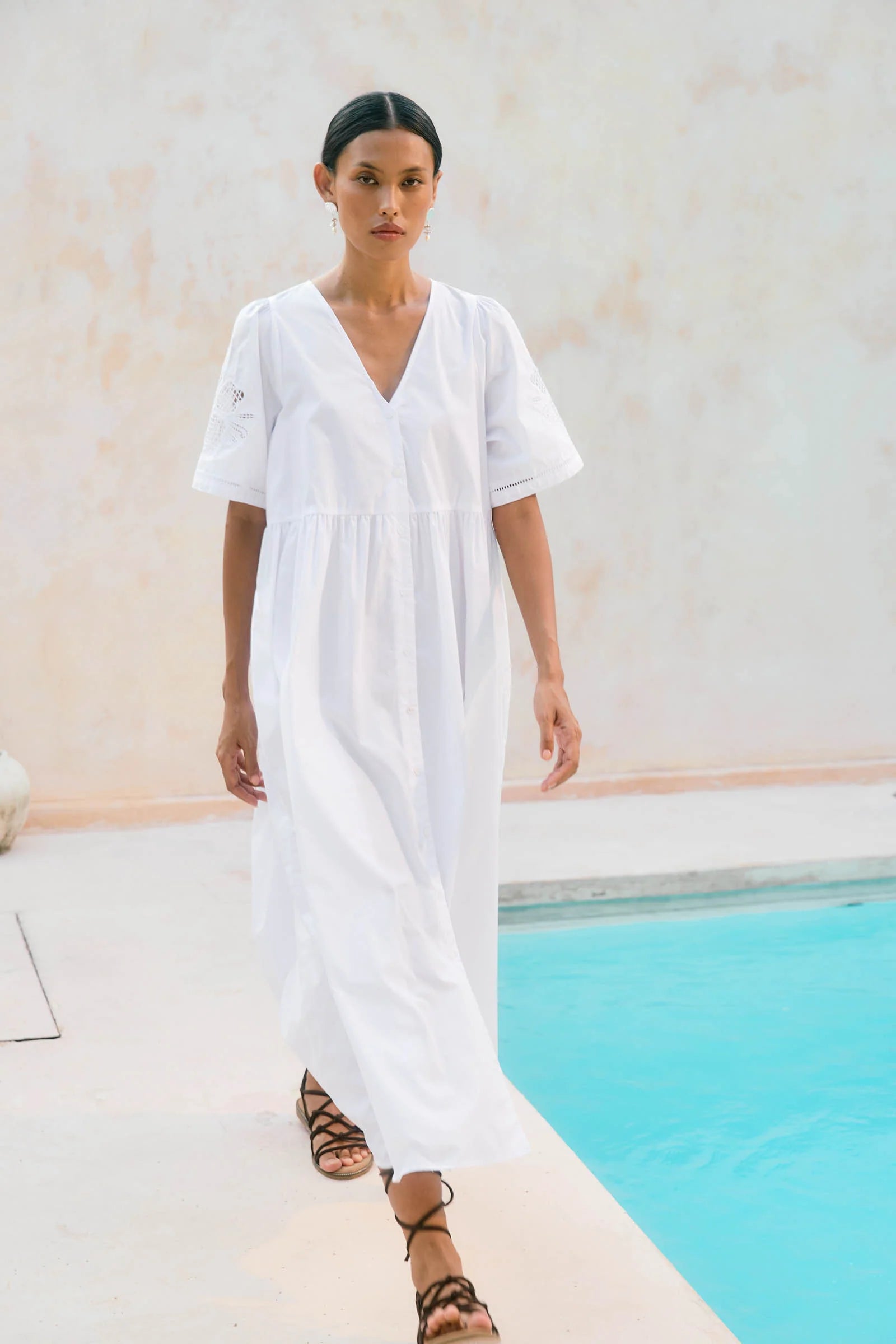 Looking for the perfect summer dress? The Nilsa Dress has arrived. Crafted in breathable cotton poplin with delicate cutwork embroidery and ladder lace, this button-through style balances structure with softness.