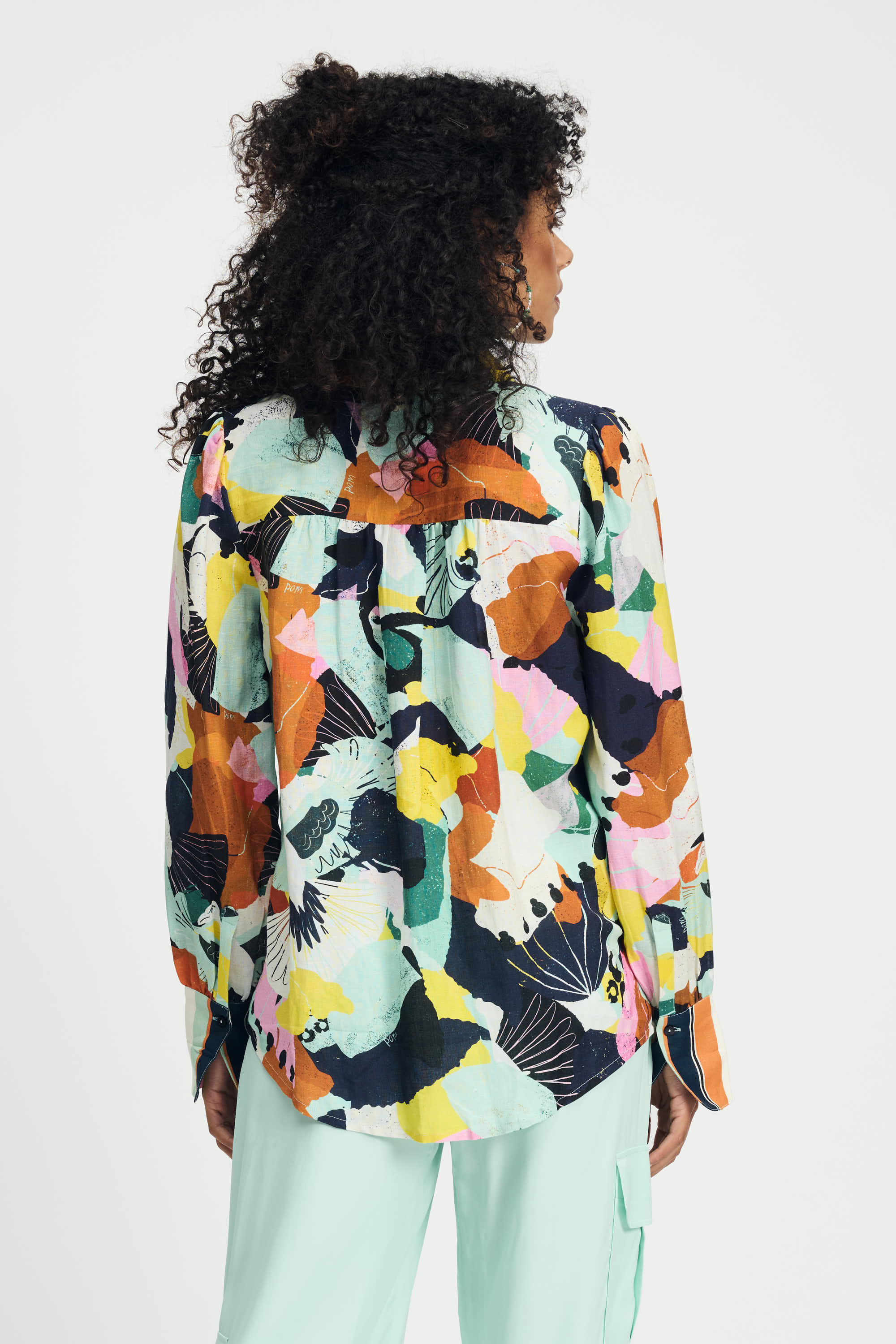 This blouse features a unique bird print and is made from a soft linen/viscose quality. The top has cuffs in contrasting stripe print. The cuffs can be folded up for a casual look.